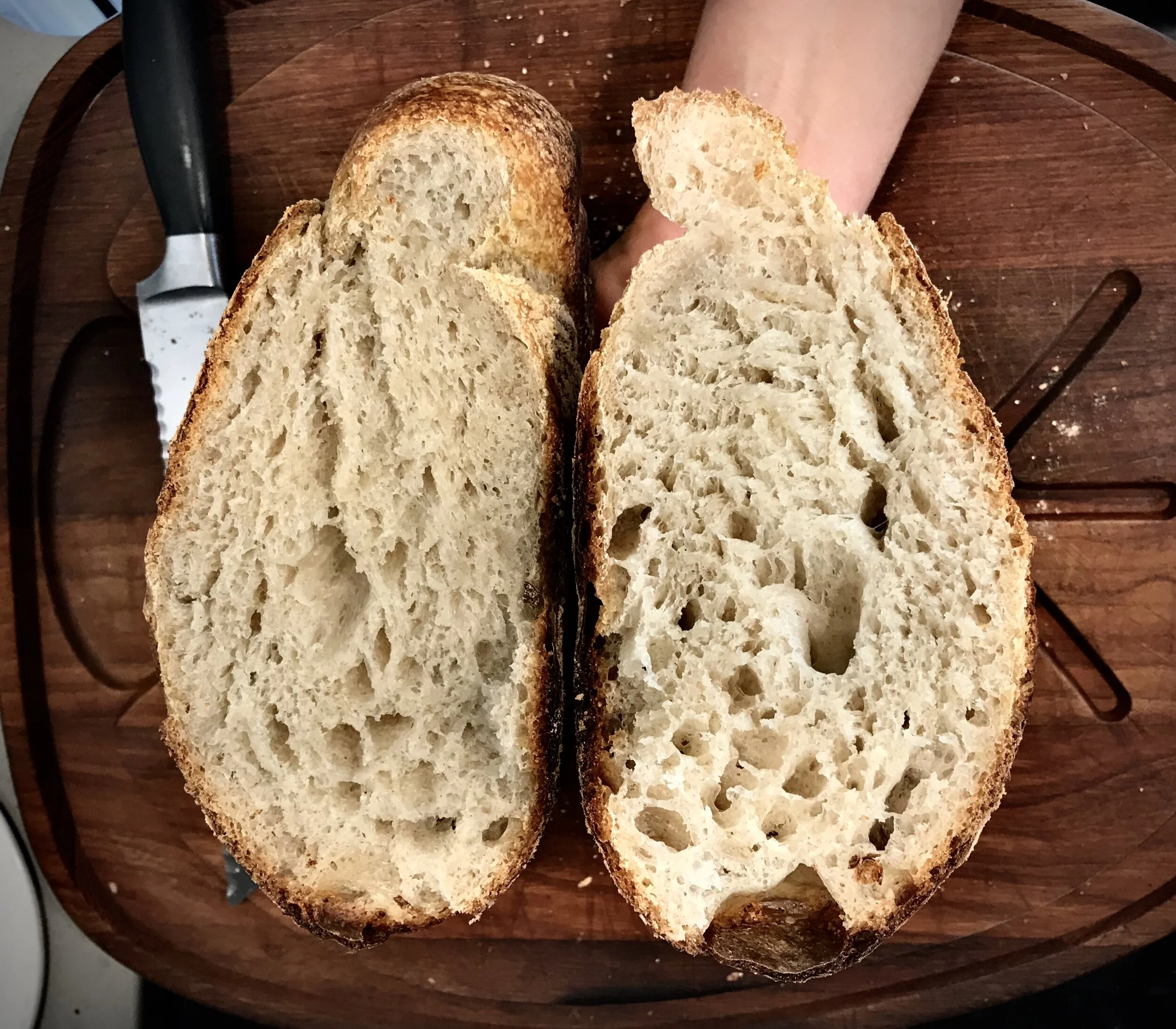 In addition to my bread birthing a tumor, it didn’t have a huge oven spring and that classic sourdough ear was missing. I am attributing that to the lack of flexibility in the dough as well, since the crumb was fairly airy and indicated that the gluten bonds were strong. However, sometimes the same result of no ear/oven spring can occur when you don’t knead your bread enough. Kneading creates the long protein strands that form gluten. The stronger the gluten, the stronger the bread. Strong gluten is important to be able to stretch and accommodate the yeast farts without breaking. If the gluten isn’t strong enough, it will collapse under the air pressure, forming a really dense bread. I’ve often heard complaints from first-time bakers that their loaf turns out like a hockey puck. Knead more, my friends, that’s all it takes.