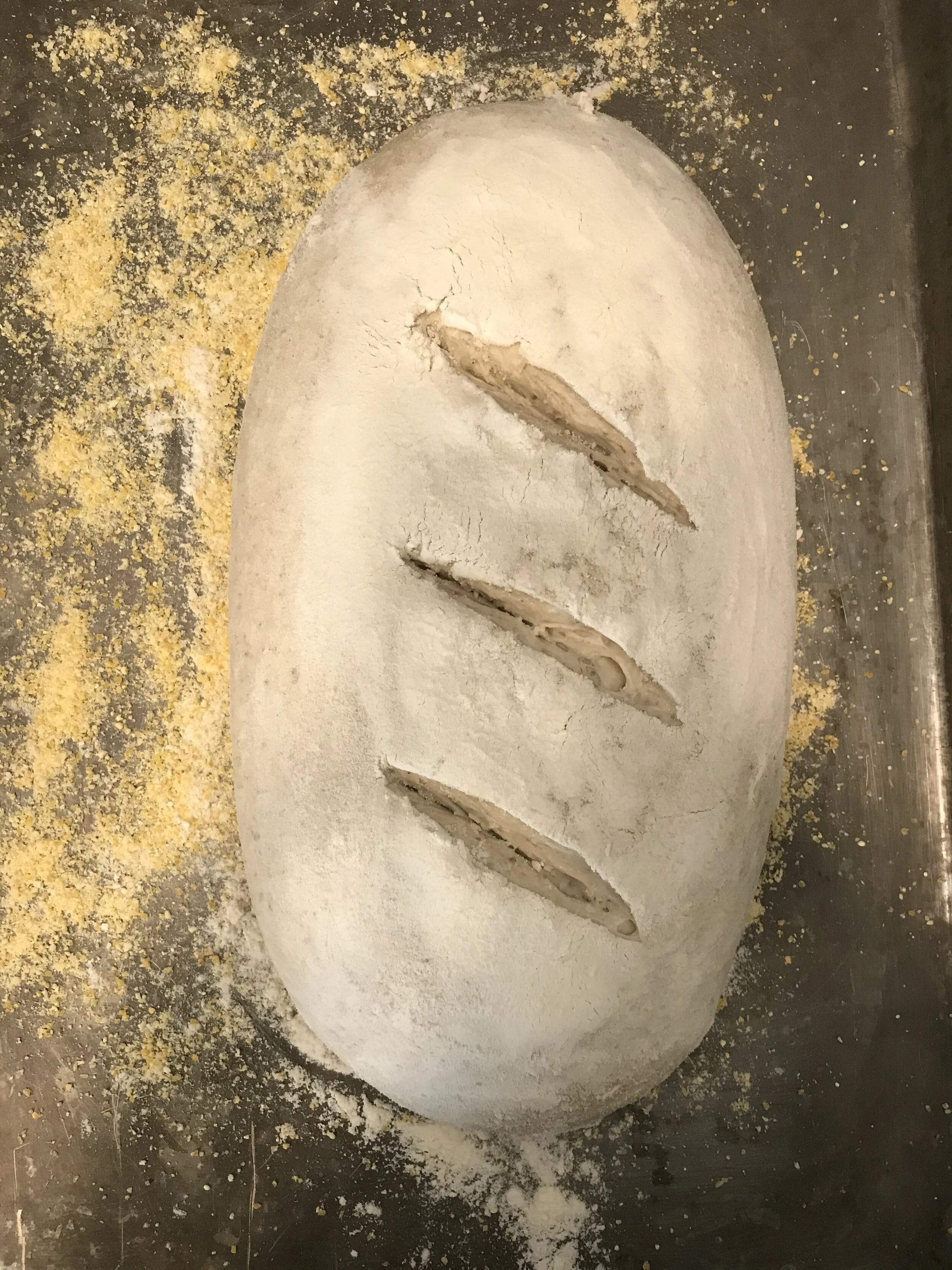 A snapshot just before going in the oven. My score lines were 1.5 inches deep…so it should’ve been enough to all expansion…